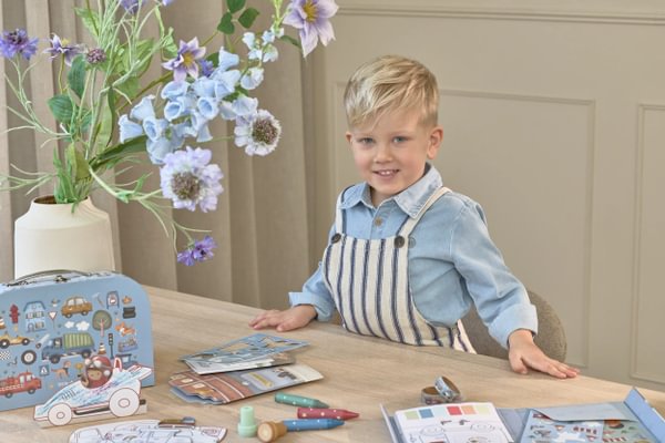 Leiskite kūrybiškumui lietis su šiuo linksmu Jim rankdarbių lagaminu. Tvirtame, gausiai dekoruotame dėkle rasite viską, ko reikia piešimui, klijavimui ir antspaudavimui: šablonus, lipdukus, pieštukus, antspaudus, spalvinimo korteles ir lipnią juostelę. Puikiai tinka kurti gražius mažus meno kūrinius ir kartu kurti prisiminimus. Pagaminta iš kartono ir popieriaus, idealiai tinka mažoms rankytėms.