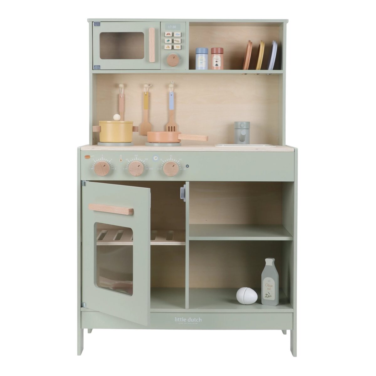 Mažieji virėjai gali kibti į darbą šioje gražioje mėtinės spalvos medinėje žaidimų virtuvėlėje! Iškepkite gardų pyragą orkaitėje, virkite šviežias daržoves ant viryklės arba keptuvėje iškepkite kiaušinį. Virtuvėje yra dvi keptuvės, virtuvės reikmenys, trys lėkštės ir kriauklė rankoms nusiplauti. Taip pat pridedama: butelis alyvuogių aliejaus, druskos ir pipirų rinkinys bei spintelė tvarkingam maisto produktų laikymui. Mikrobangų krosnelė turi tikras rankenėles su iliustracijomis, kad žaidimas būtų dar linksmesnis. Kas šiandien gaminama?